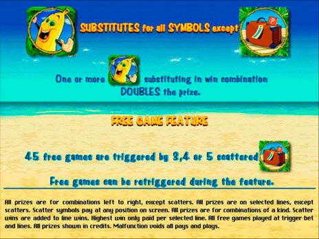 Видео слот Bananas Go Bahamas – одна из увлекательных разработок игровых автоматов, которая приносит клиентам достойное денежное вознаграждение. Приятная графика, анимация и красочное оформление создадут легкую игровую атмосферу. Некоторым игрокам видео слот может показаться скучным и устаревшим, ведь у каждого свой вкус. По функциям и параметрам игры игровой автомат похож на такие видео слоты, как Sparta, Sizzling Hot Deluxe и Silver Fox.