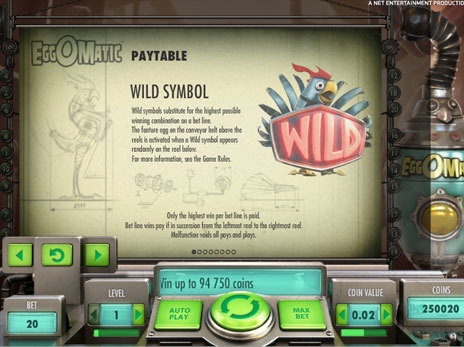 В видео слоте EggOMatic представлена увлекательная и захватывающая игра, которая происходит на фабрике по разводу птиц. Обитателями фабрики стали замененные роботами домашние курицы. Животные произведены из металлического вещества. Продукцией птиц становятся металлические яйца.