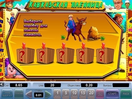 Рискованный раунд игрового автомата Kavkaz выполнен в тематическом стиле. Удачный спин, который приносит денежную выплату, предлагает пользователю рискнуть и увеличить приз вдвое. На экране появляются две мужские туфли. Суть игры проста и понятна. Под одной туфлей спрятаны деньги. Если клиент находит купюру, то выигрыш за последний раунд автоматически удваивается. Неудачный выбор обуви приводит к окончанию призового раунда. А клиент теряет денежную сумму, полученную в последнем раунде.