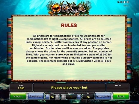 На главном экране игрового автомата Orca картинки выполнены в тематике морских глубин. Главным персонажем игрового автомата выступает дельфин. Если этот знак заполнит собой игровое окно, то клиент казино заработает 1000 бесплатных ставок.