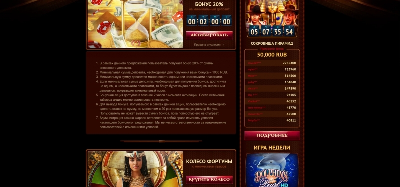 👑 При регистрации довольно часто клиентам начисляется стартовый капитал для начала игры. Казино Фараон Бет бездепозитного счета своим игрокам не предоставляет. Кроме того, сотрудники сайта не поощряют недавно зарегистрировавшихся клиентов приятными подарками. Система лояльности не распространяется и на первый клиентский депозит. Получить бонусы за первое пополнение денежного лимита невозможно.