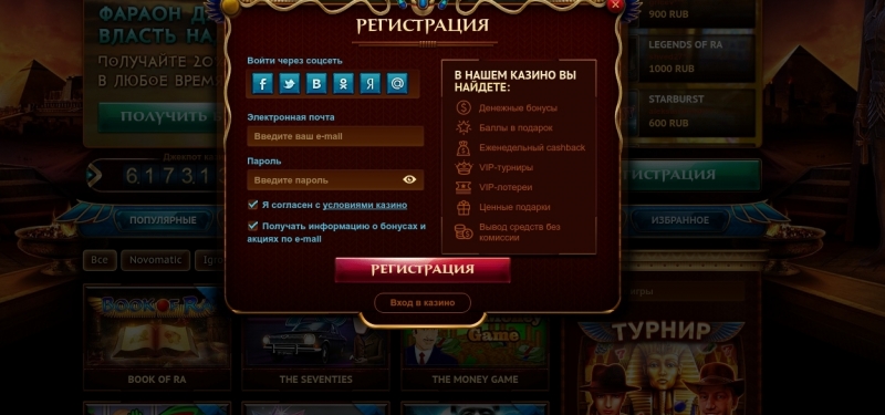 🎁 Перед входом на сайт казино Фараон Бет пользователь вводит адрес электронной почты и придумывает собственный пароль. Разглашать информацию об этих данных не рекомендуется. Администрация сайта не несет ответственности за ваши действия. Длительность регистрации на игровой площадке Pharaon Bet не превышает 15 секунд.