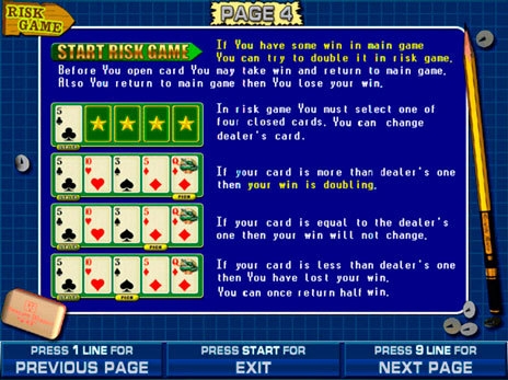 Удачный раунд, в котором пользователь получает денежную выплату, заканчивается рискованной игрой. Клиент самостоятельно выбирает участие или неучастие в ней.