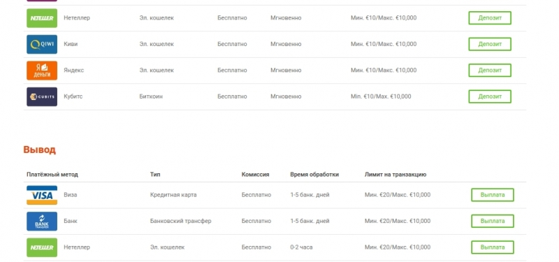 💵 На странице «Платежи» предоставлена информация о методах пополнения счета и вывода выигрыша. В таблице указаны тип, метод, время обработки данных, лимиты вывода и иные параметры.