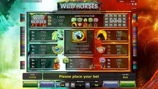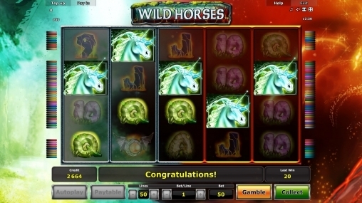 Wild Horses – это видео слот, оборудованный 5 игровыми барабанами и 50 игровыми линиями. Сколько в игре использовать тех и других, решает сам игрок. При этом размер ставки колеблется от 1 до 200 кредитов, но максимальная ставка не может превышать 10000 единиц.